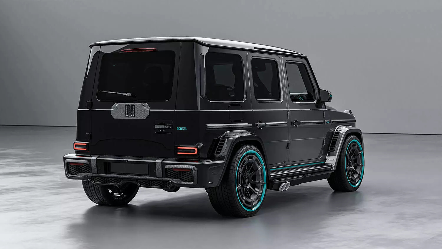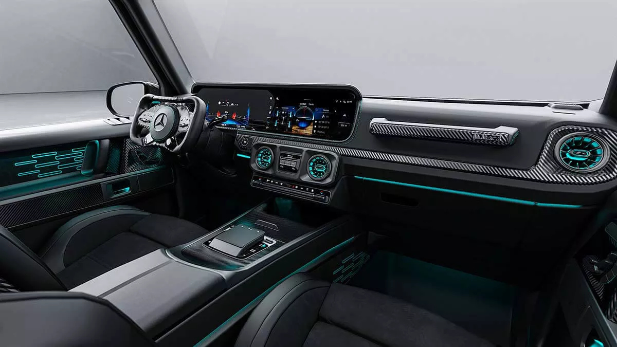 A custom wide-body kit, flared arches, blacked-out grilles, a bespoke hood, and new rocker panels give it an imposing stance. The unique fade from Sterling Silver to black, accented by Petronas-inspired turquoise stripes, echoes Mercedes’ F1 livery.