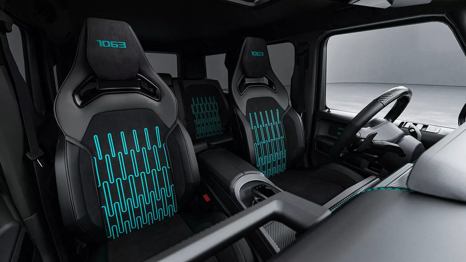 The interior is as wild as the rest of the build. The steering wheel is an F1-inspired creation reminiscent of the one in the AMG One hypercar, with flat edges and controls that scream motorsport.
